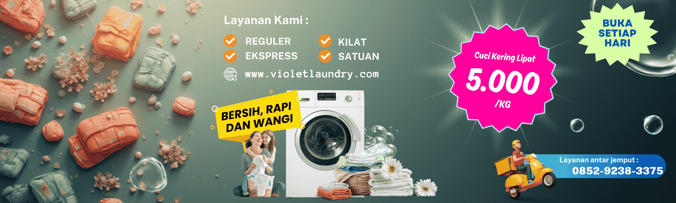 Violet Laundry adalah layanan laundry profesional yang menawarkan hasil cucian bersih, wangi, dan rapi dengan berbagai pilihan layanan: Reguler, Express, Kilat, hingga Laundry Satuan. Mengutamakan kualitas, ketepatan waktu, serta layanan antar–jemput untuk kenyamanan Anda. Wanginya Violet, Bersihnya Sempurna.